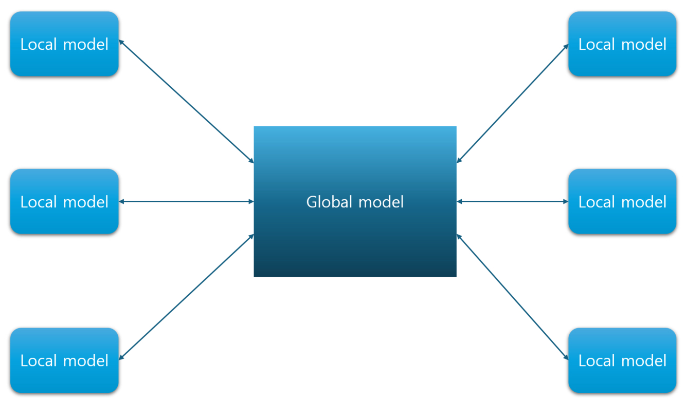 즉, 여러대의 디바이스들이 존재한다고 가정할때, 이들의 데이터가아닌 이들이 가진 가중치들을 서로 공유함으로써 글로벌 모델은 거시적인 인사이트를 얻고 이를 모든 디바이스들에게 공유하는 방식인 것입니다.